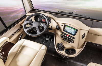 DAS FAHRERHAUS. Bedienerfreundlichkeit ist das bestimmende Element im modern und funktional gestalteten Fahrerbereich. Die ergonomische Platzierung der Schaltung und des Radio-Navigationssystem ist auf den Fahrer zugeschnitten. Blickfang ist das optional belederte Armaturenbrett mit Bicolor- Abdeckung. Die automotive Einbindung ins Fahrerhaus und der neu gestaltete Übergang in den Wohnbereich bilden eine harmonische Einheit.