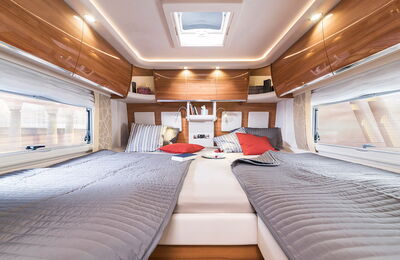 DER SCHLAFRAUM. Willkommen im märchenhaft bequemen Schlafbereich! Das hochwertige Concorde Schlafsystem mit Deluxe-Matratze und stabiler Unterfederung ist so komfortabel, dass man gar nicht mehr aufstehen mag. Eine atemberaubende Großzügigkeit beeindruckt auch hier — sei es bei Stauräumen oder Bettenmaßen. Garantiert kein Traum: In diesem Reisemobil fühlen Sie sich wie in einer 5-Sterne-Suite.