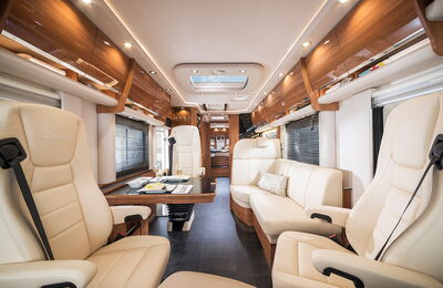 DER WOHNRAUM. Eine Wohnlandschaft, wie sie für ein Concorde Premium-Reisemobil typisch ist: Großzügig dimensioniert, hochwertig ausgestattet, unglaublich bequem. Die Sitzgruppe wird modellabhängig als Barversion oder mit einem fünften Sitzplatz in der Lounge-Version angeboten. Für noch mehr Freiraum auf Reisen lassen sich Fahrer- und Beifahrersitz perfekt in den Wohnraum integrieren. Unterstützt wird der großzügige Raumeindruck durch das Concorde One Level Concept mit einer vom Fahrerhaus bis zum Schlafraum durchgehenden stufenlosen Ebene.