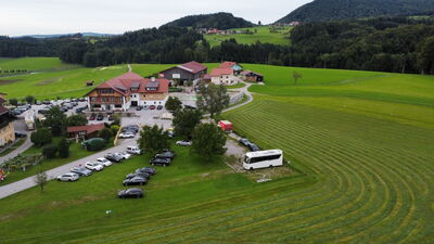 Auf einer großen Wiese vor der Golfanlage stehen zwei Stellplätze für Wohnmobile mit Stromanschlüssen bereit. Perfekt! Mit einem herrlichen Sonnenuntergang über dem Salzburger Land verabschiedet sich ein wunderschöner Tag.