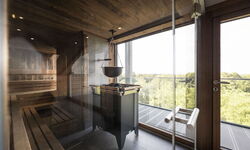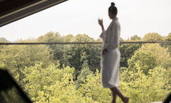 Besonderes Highlight: Die spektakuläre Sky Sauna im 6. Stock mit Aussicht über die Baumwipfel und die Region.